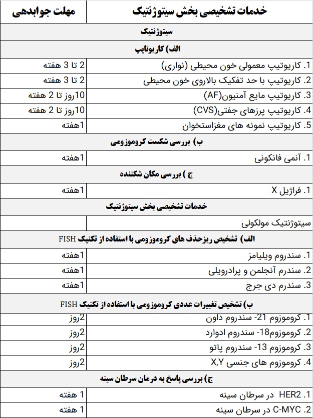 تست های مربوط به بخش سیتوژنتیک بر روی نمونه های خون هپارینه و کلیه نمونه های جنینی و مغزاستخوان قابل پذیرش می باشد.